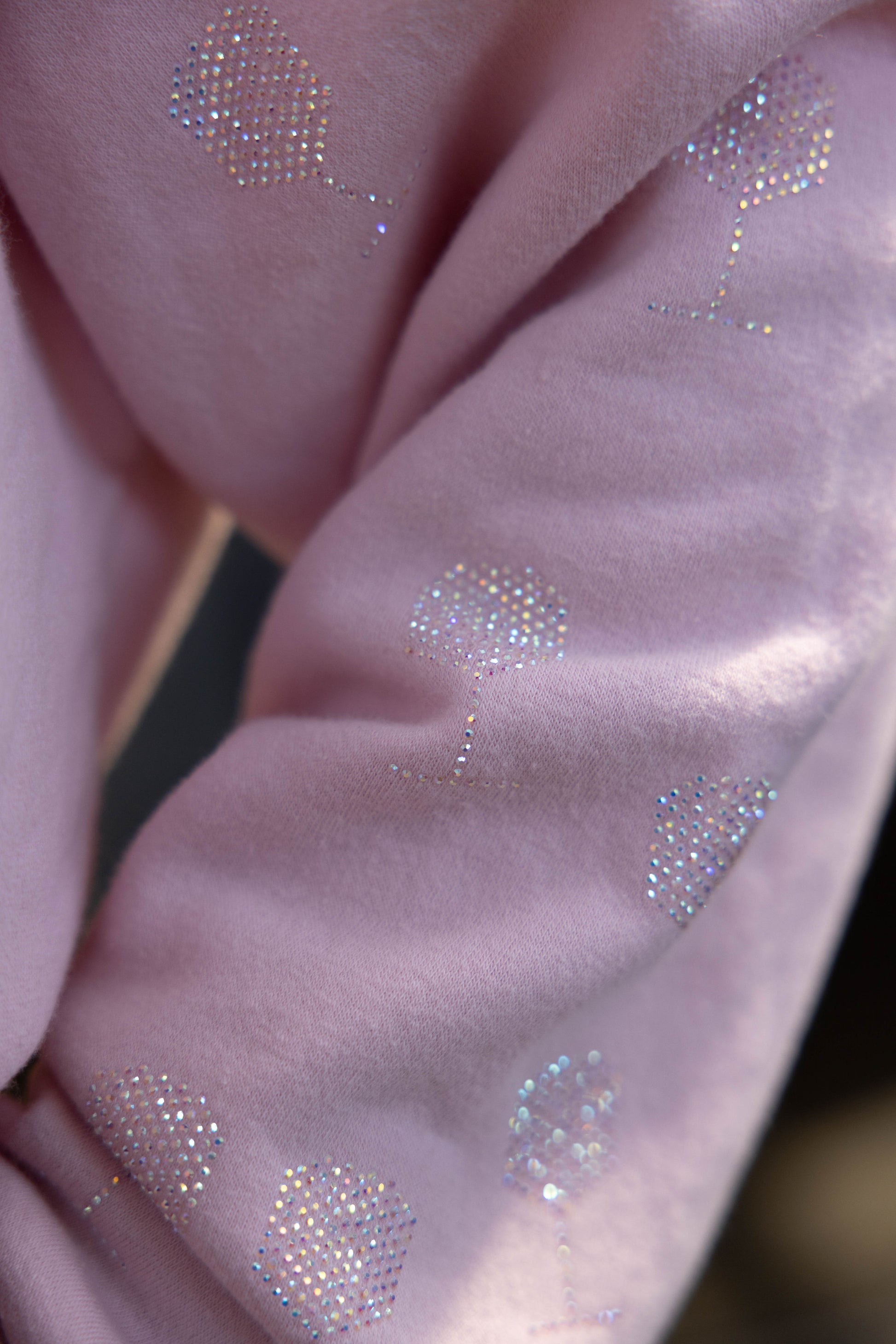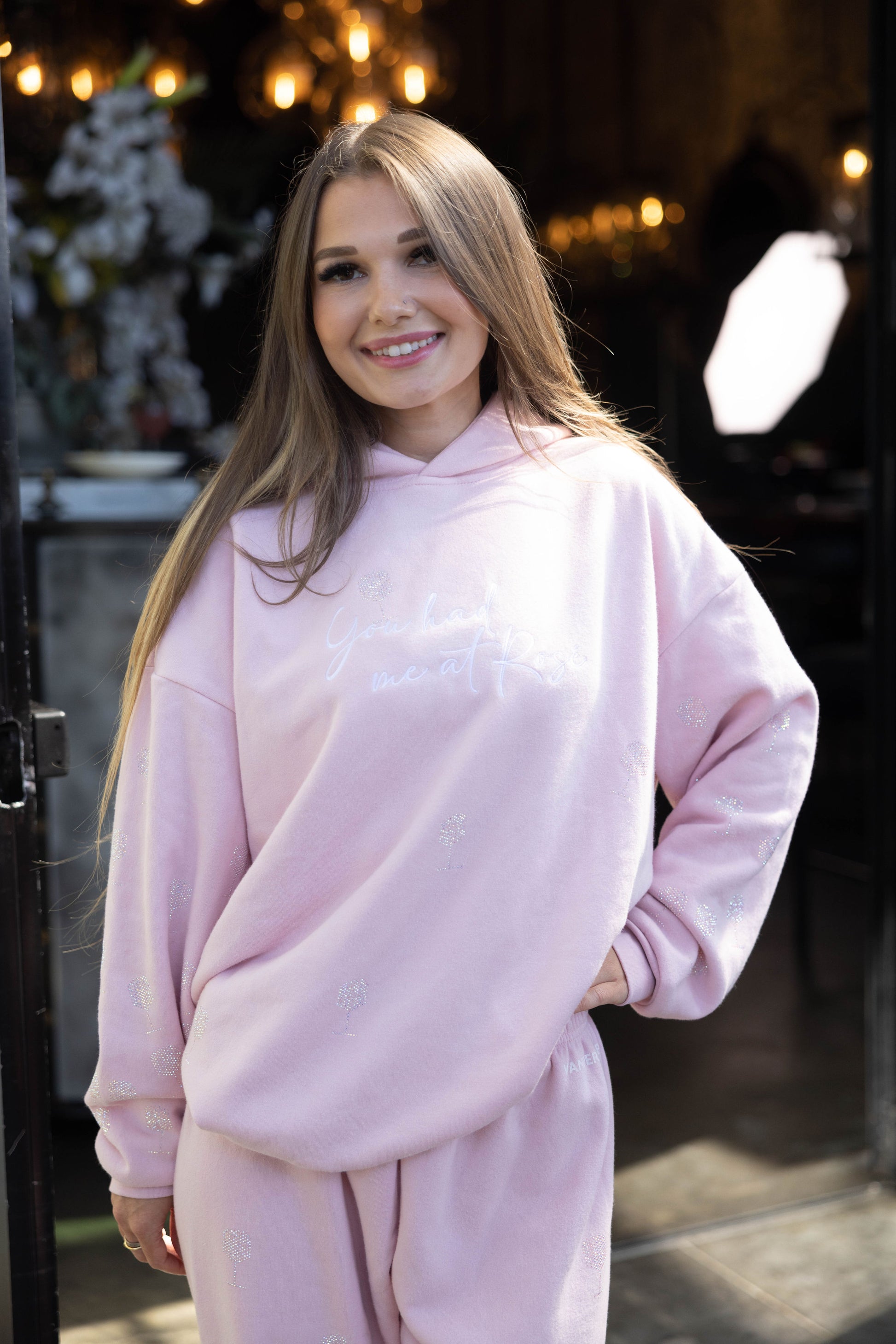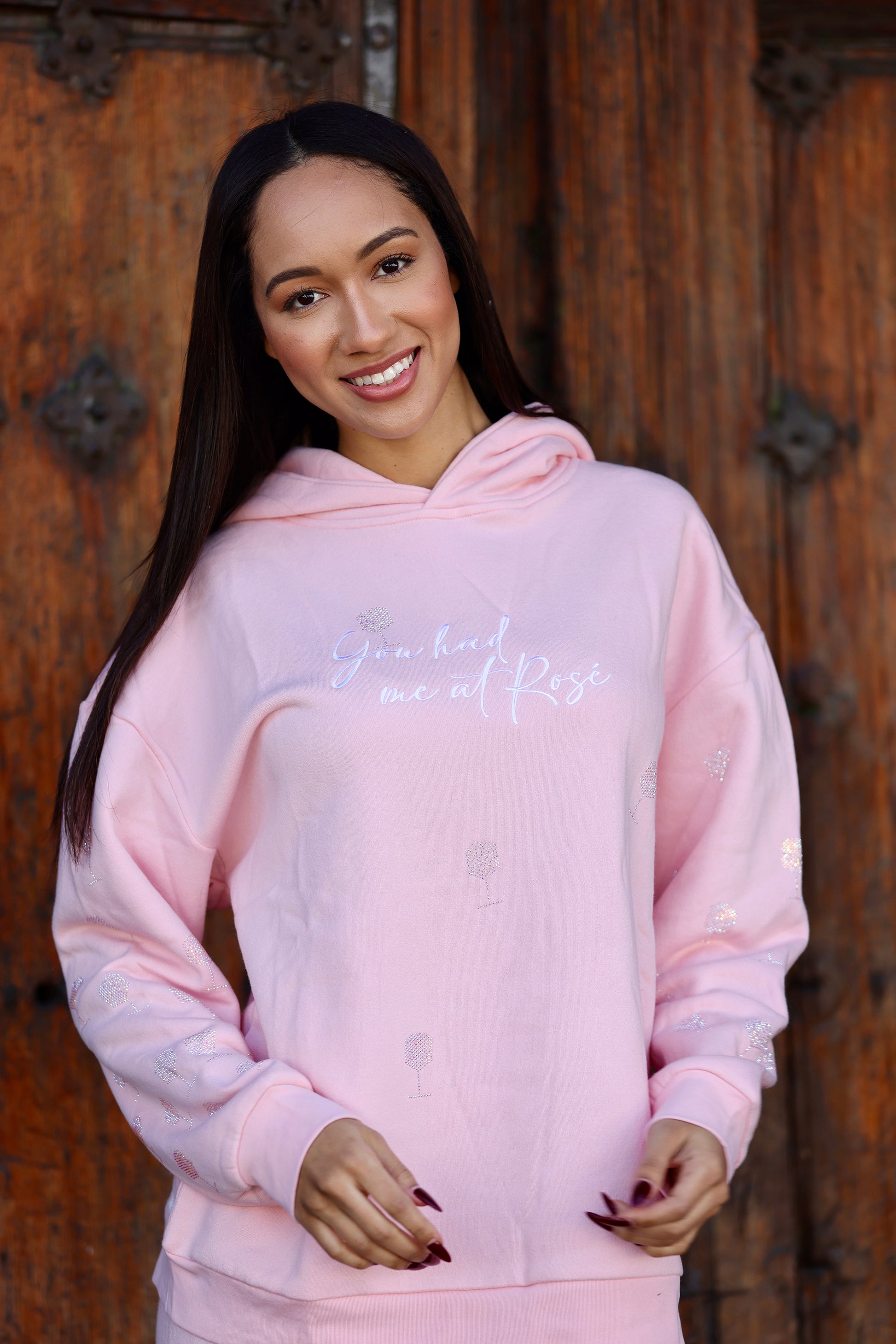 "You Had me at Rosé" embroidered pink hoodie, made of 100% soft cotton. Oversized fit. Mini crystal wine glasses on the front, back and sleeves. Quote note on sleeve “Drink Happy Thoughts.” Lined hood. Custom Vanderpump neck tape detail.