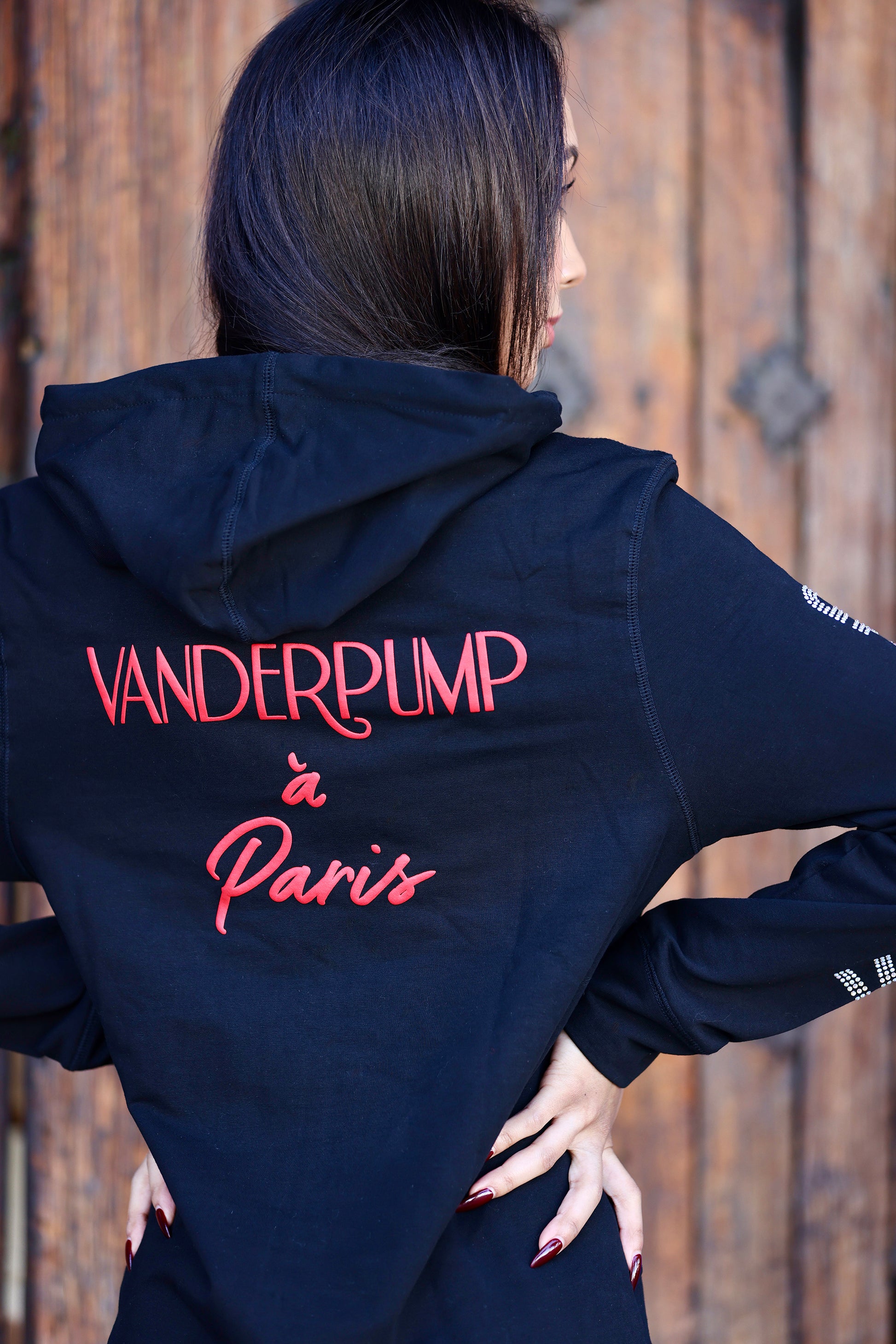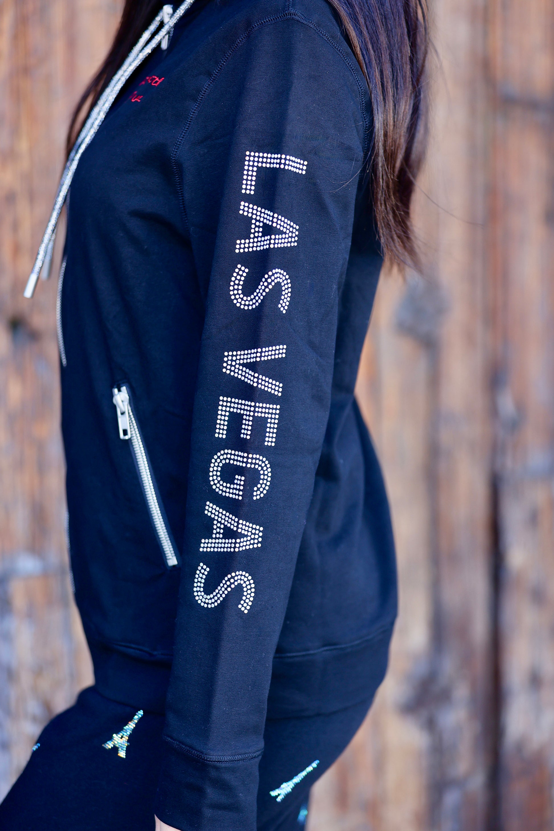Vanderpump à Paris zip up hoodie made of 100% cotton. Featuring "Vanderpump" & "Las Vegas" on each sleeve in sparkly crystals. Vanderpump Paris contrast Logo printed back. "Let's do it the French way" contrast logo printed on front. Chunky zippers in an antique silver finish. Crystal drawcords with metal aglets. Front pockets with zipper closure. Lined hood. Custom neck tape detail.